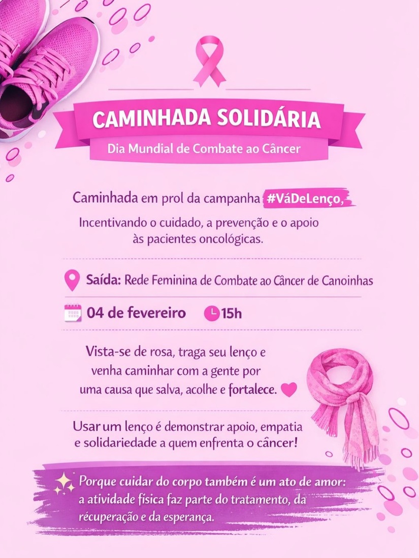 No dia 04/02 a Rede Feminina de Combate ao Câncer realizará uma caminhada. Em prol da campanha vá de Lenço.