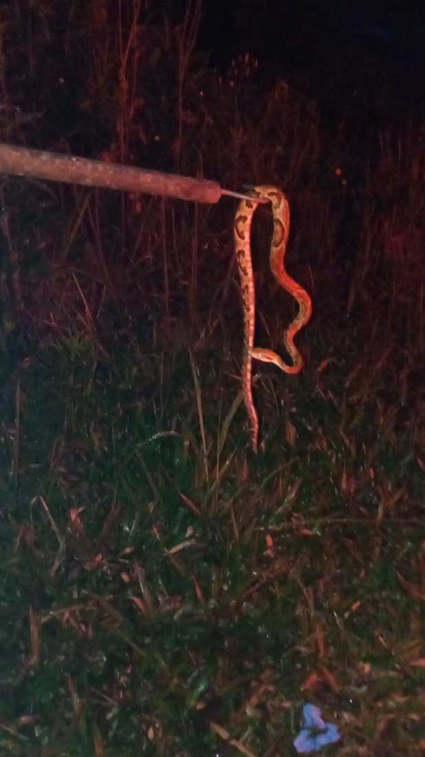 A equipe, que se deslocou em uma viatura, encontrou no local uma serpente da espécie Bothrops jararaca — conhecida popularmente como jararaca — próxima à garagem da residência.