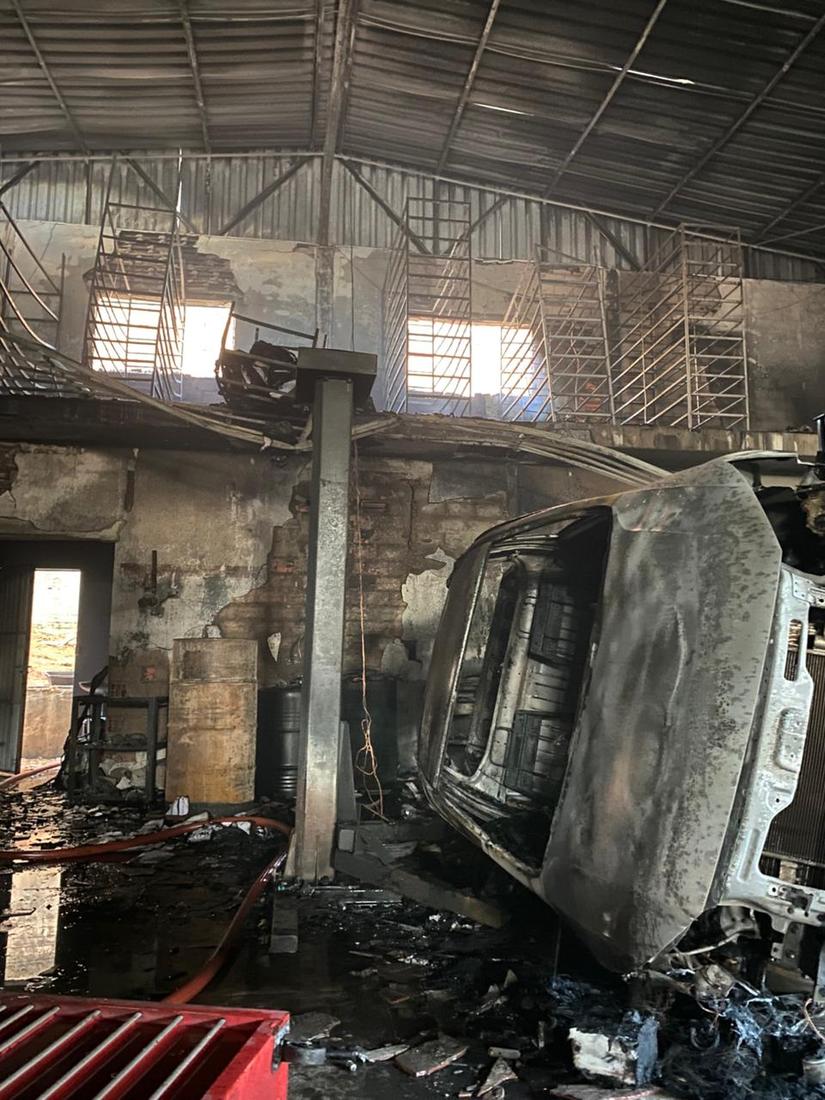 No interior do barracão havia nove veículos, alguns deles com danos significativos. Na parte externa, ao lado da edificação, estavam quatro automóveis estacionados, que não foram atingidos pelas chamas.