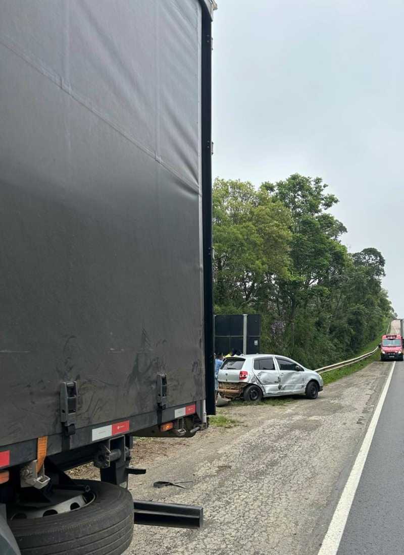 No local, foi confirmado que a ocorrência envolvia um Volkswagen Fox prata e uma carreta Volvo azul. Segundo relatos, o veículo de passeio tentou ultrapassagem na faixa da direita, colidindo com a lateral dianteira do caminhão. Com o impacto, o carro rodou à frente do caminhão e saiu da pista, mas não houve capotamento.