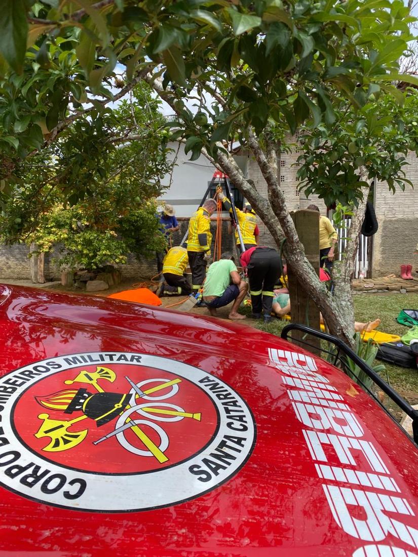 Por volta das 09h26min as guarnições do ASU-459, ABTR-101 e AR-239 foram acionados, via COBOM de Canoinhas, para atendimento de um resgate de uma mulher de 49 anos que caiu num poço. Chegando no local, a natureza da ocorrência foi confirmada, tratando-se de uma paciente consciente, orientada, em pé, apoiada em uma escada no interior de um poço de aproximadamente 12 metros de profundidade e 1,2 metros de diâmetro. Além da paciente, também estava no interior do poço um homem, maior de idade, consciente, orientado, sem lesões aparentes, que tinha descido para tentar ajudar a mulher. Após dimensionamento da cena, o bombeiro resgatista realizou uma comunicação prévia com a vítima para acalmá-la. Concomitantemente, foi realizada a montagem do sistema de resgate com uso do tripé e um sistema de redução de força 5x1. Após acessadas as pessoas no poço, foi constatada, na vítima feminina, uma suspeita de lesão em acrômio esquerdo, na medula região da sacrococcígeo, pelve e suspeita de fratura em membro superior direito, região medial de rádio. Em seguida, ambas as vítimas foram resgatadas em segurança. A paciente ficou aos cuidados da guarnição do ASU-459, onde fora realizado restrição de movimento de coluna em maca à vácuo, utilizado colar cervical e imobilização pélvica. Devido à baixa concentração de oxigênio por ser um ambiente confinado, foi fornecido oxigenoterapia e deslocado com a paciente ao Hospital São Sebastião na cidade de Papanduva.