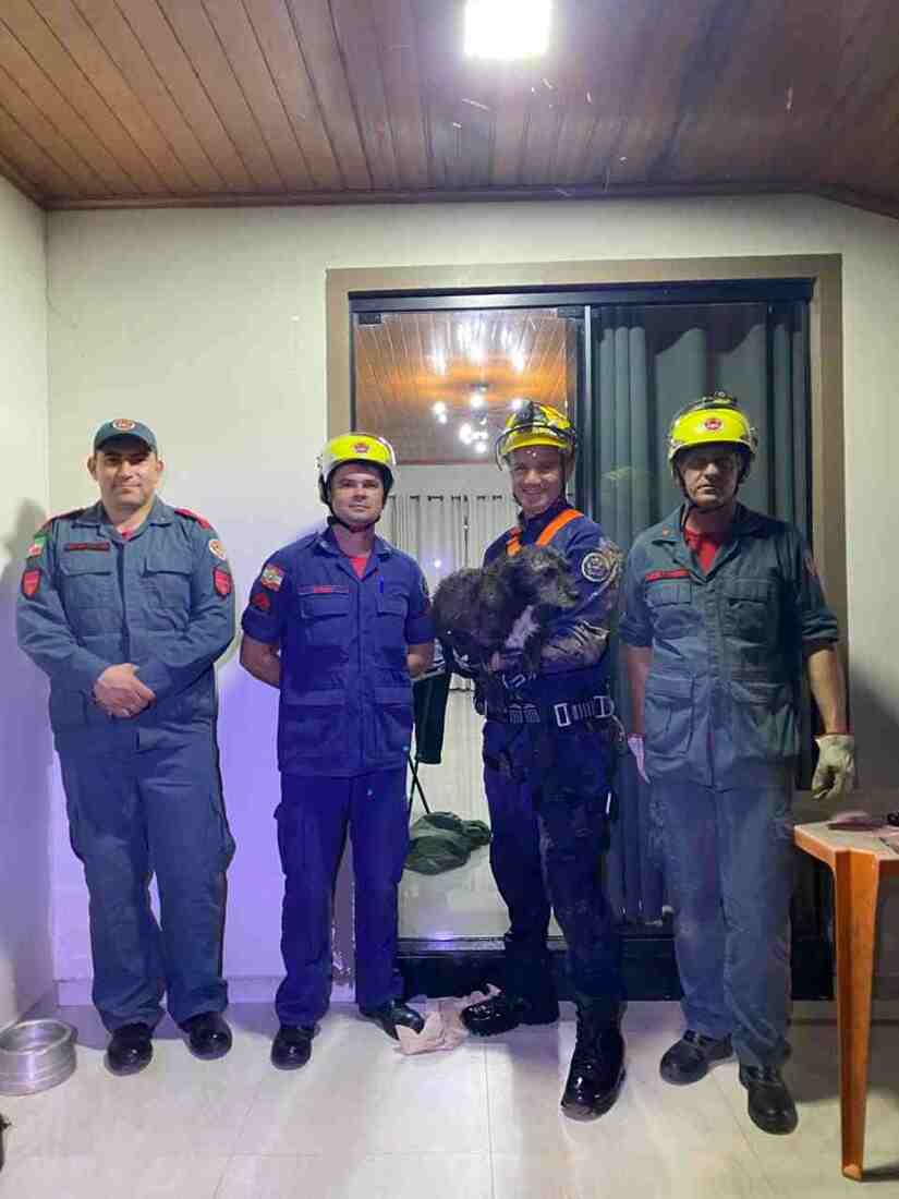 Os bombeiros foram chamados e usaram uma escada para conseguir descer até o local. Com cuidado, a equipe conseguiu retirar a cadela e levá-la de volta para um lugar seguro.
