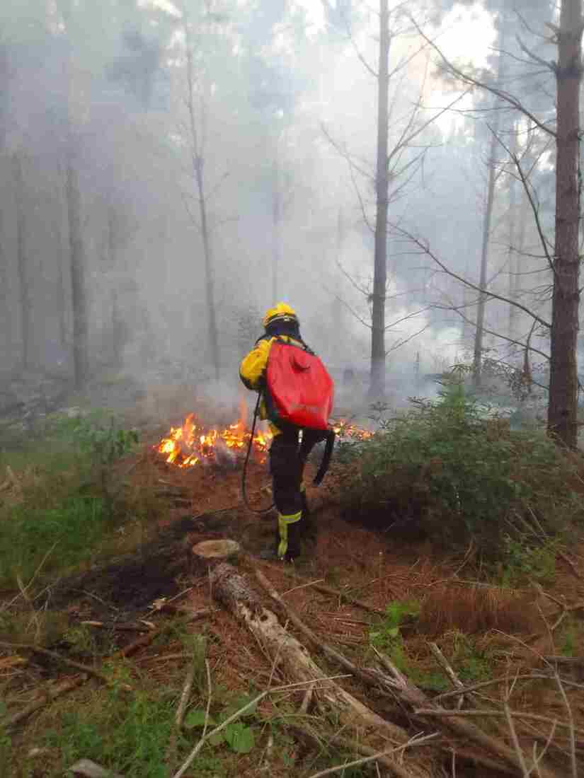 Ao chegarem, os bombeiros constataram que o fogo atingia um reflorestamento de pinus, com propagação rápida pela vegetação rasteira, se espalhando por uma grande área.