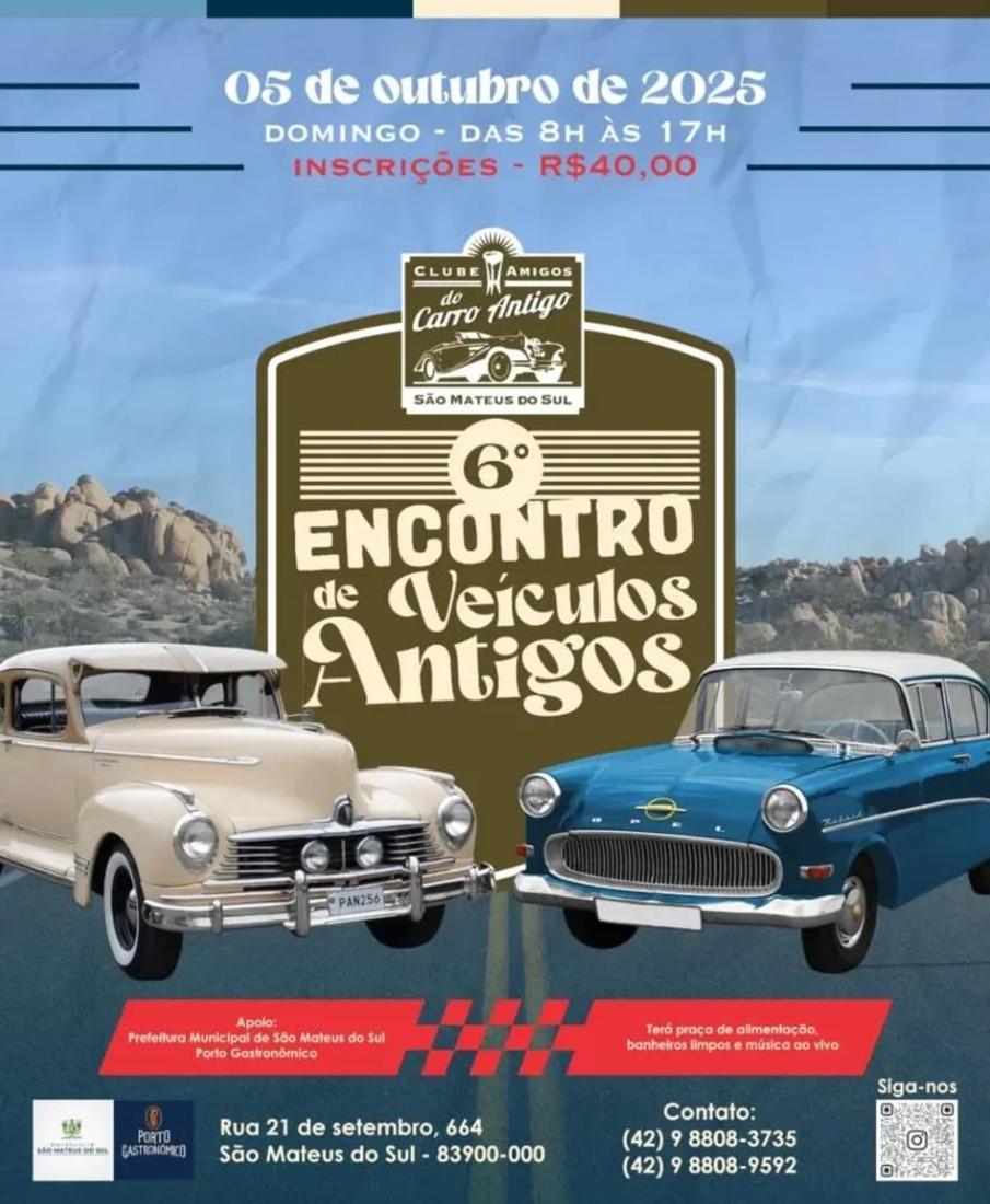 O 6º Encontro de Veículos Antigos acontece neste domingo (5), a partir das 8h, no centro de São Mateus do Sul. O evento é gratuito para o público e contará com shows ao vivo da Banda Outside (13h), Andryus Ferraz (16h) e Alabama Colts (19h).