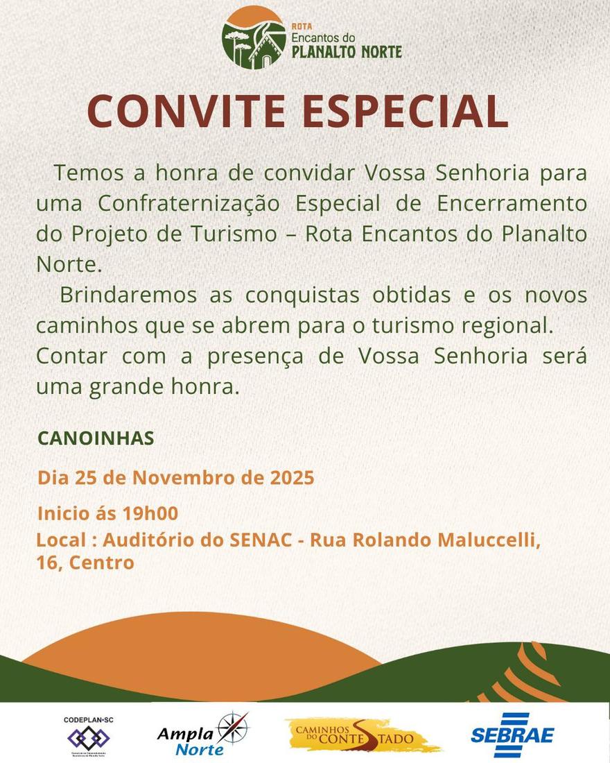 Encerramento Convite: Rota encantos do Planalto Norte Por Redação Fonte: Ascom Publicado 25/11/2025 19:48