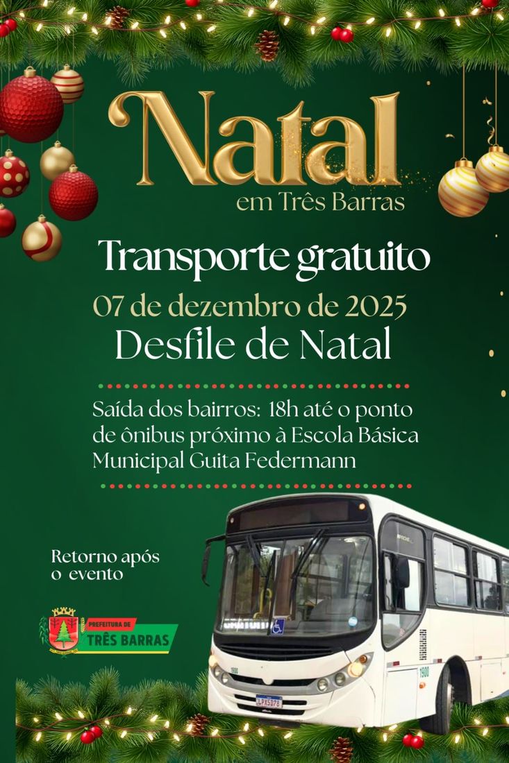 Haverá ônibus gratuito para o Desfile Natalino de Três Barras.