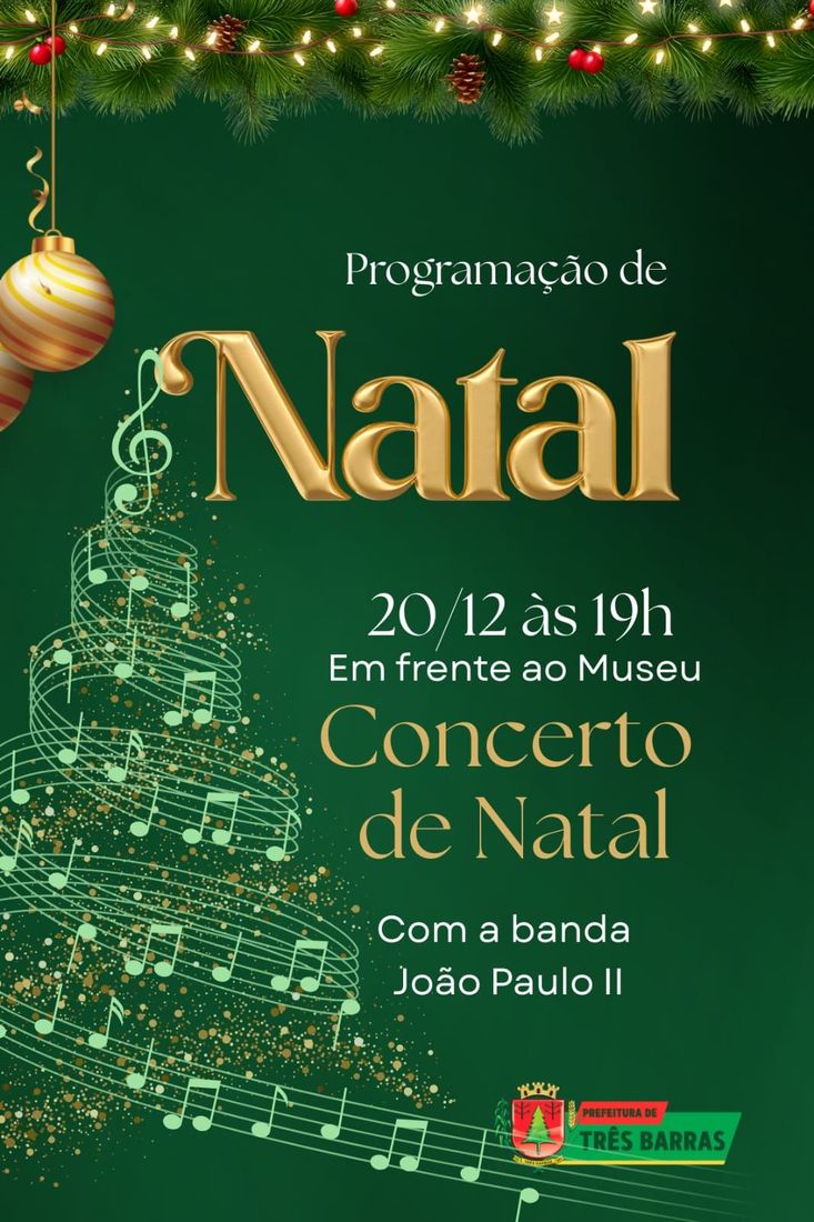 O Concerto de Natal de Três Barras acontecerá no sábado (20), às 19h, em frente ao Museu Municipal João Bedretchuk. A data, horário e programação do evento são os mesmos, apenas o local foi alterado.