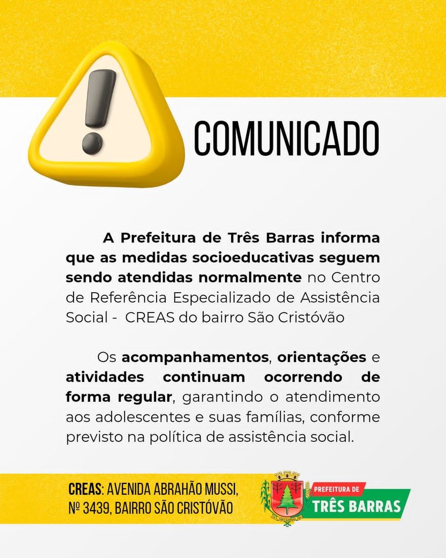 A Prefeitura de Três Barras informa a população que as medidas socioeducativas continuam sendo realizadas normalmente.