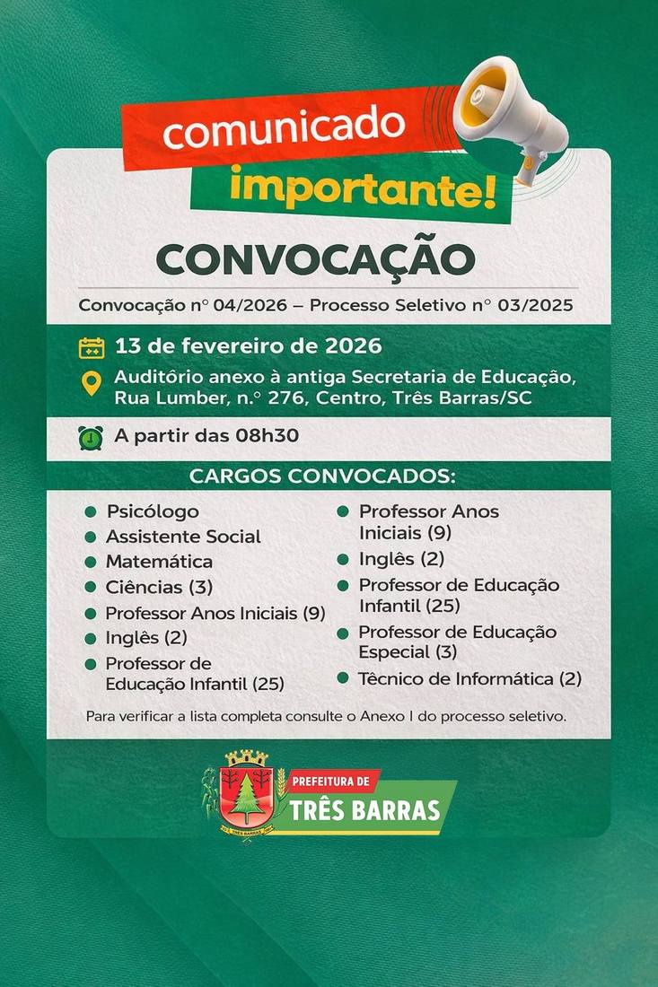 A Prefeitura de Três Barras divulgou, no início da tarde desta quarta-feira, 11, duas novas convocações. A primeira é destinada aos candidatos classificados no Processo Seletivo Simplificado N° 03/2025. A segunda convoca a candidata aprovada para o cargo da área de Assistência Social, referente ao mesmo Processo Seletivo N° 03/2025.