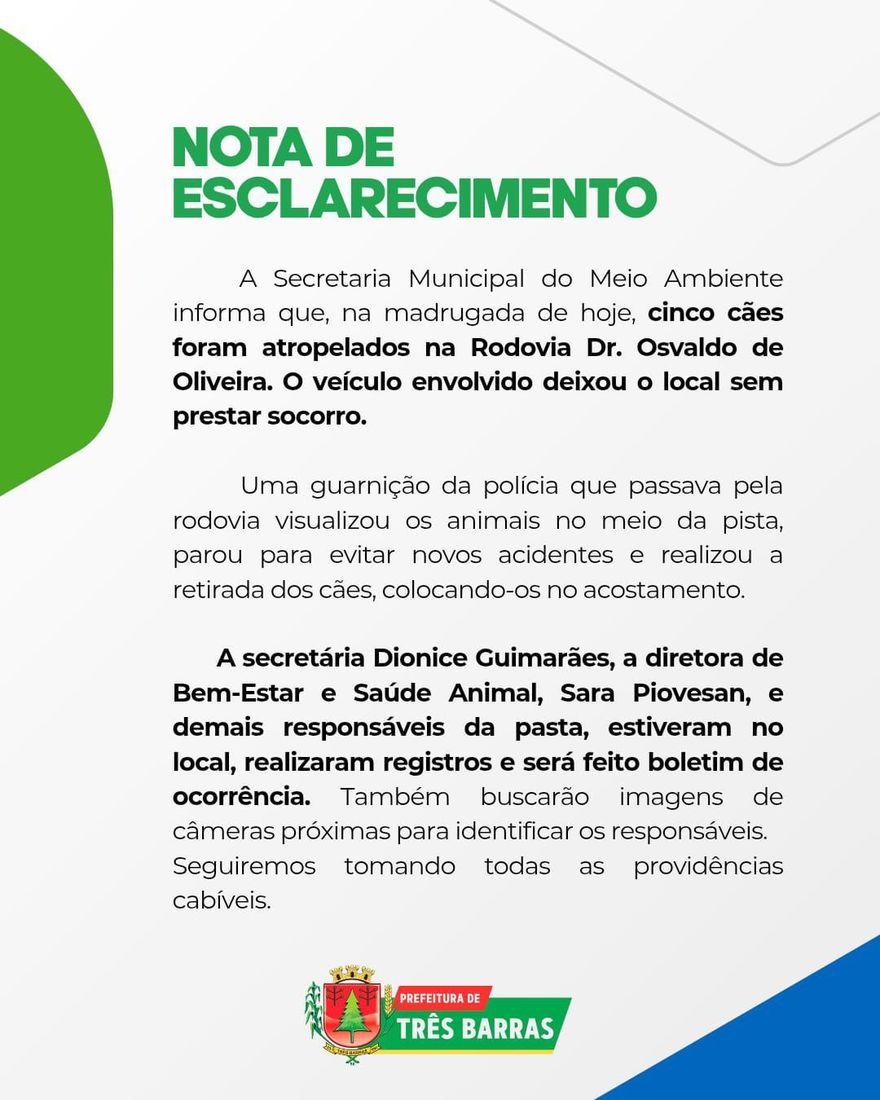 Nota de esclarecimento sobre atropelamento de cães. (Fotos: Ascom)