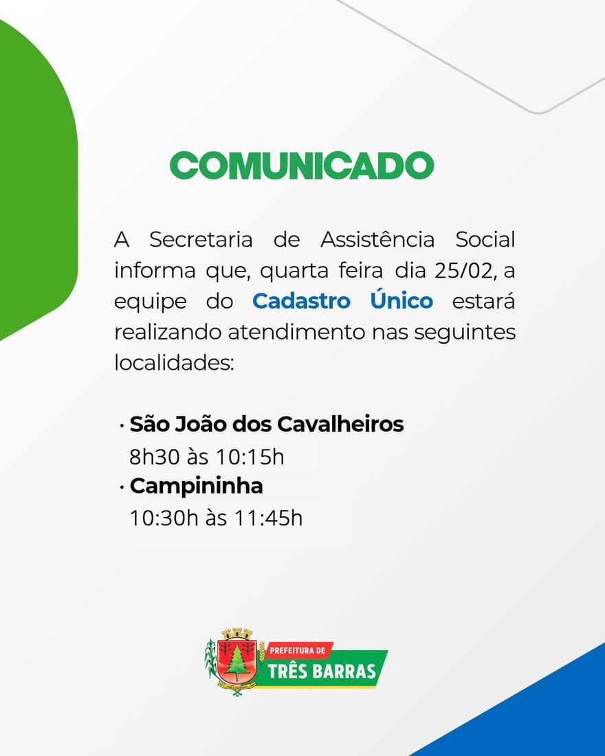 Nesta quarta-feira (25), a equipe do Cadastro Único estará realizando atendimentos nas seguintes localidades: